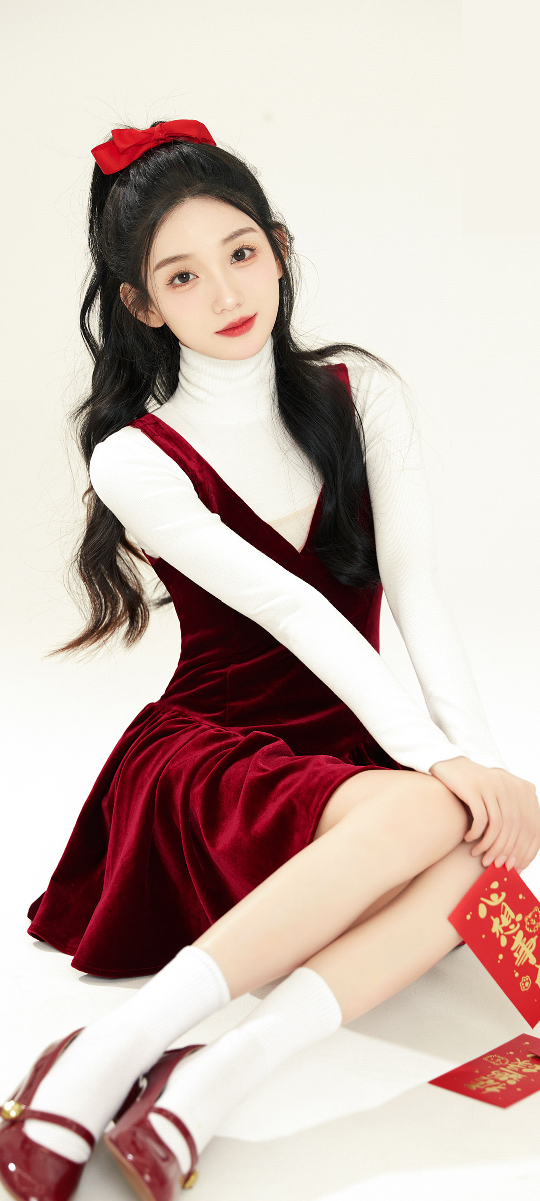 红色裙子 长发 玫瑰花 甜美美女手机壁纸