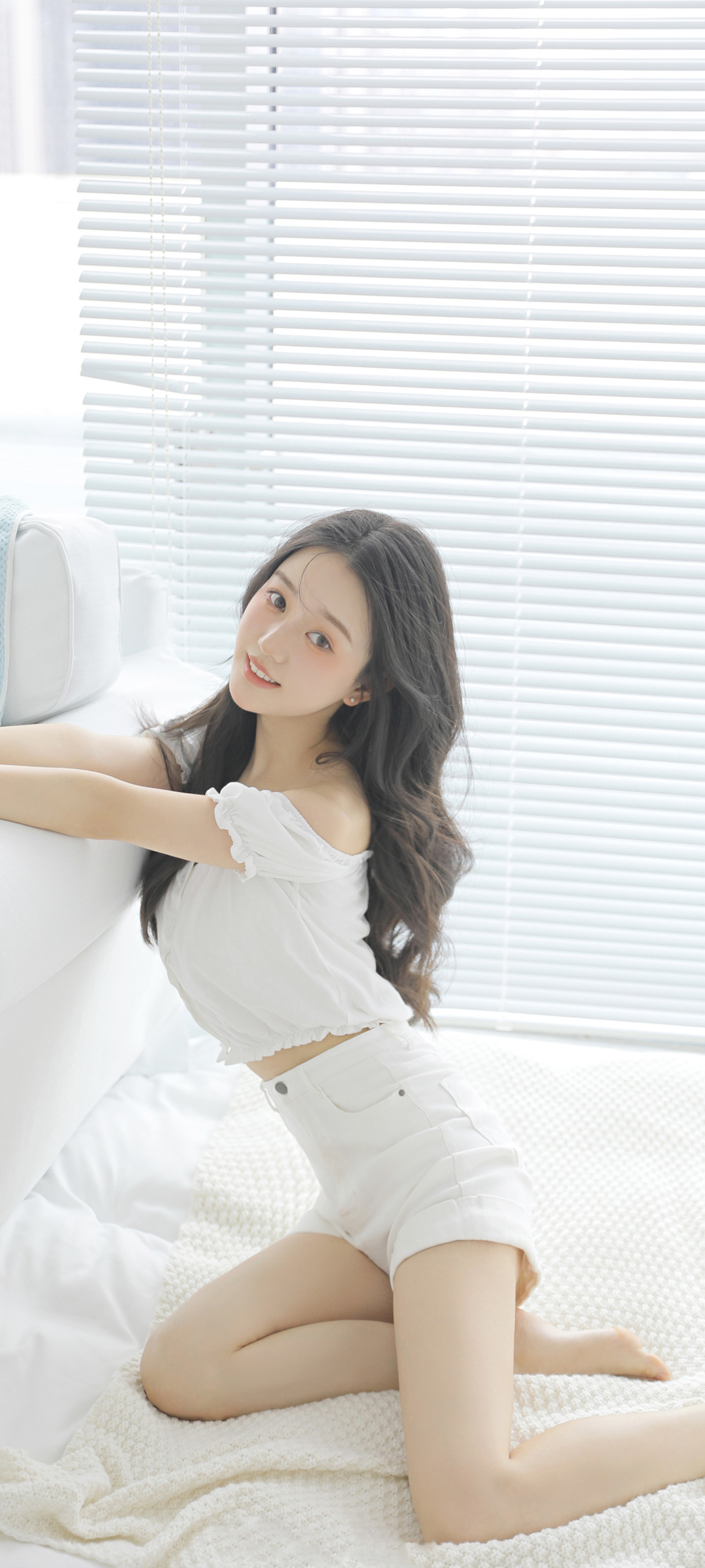 居家可爱清纯长发美女白色短裙美腿手机壁纸免费下载