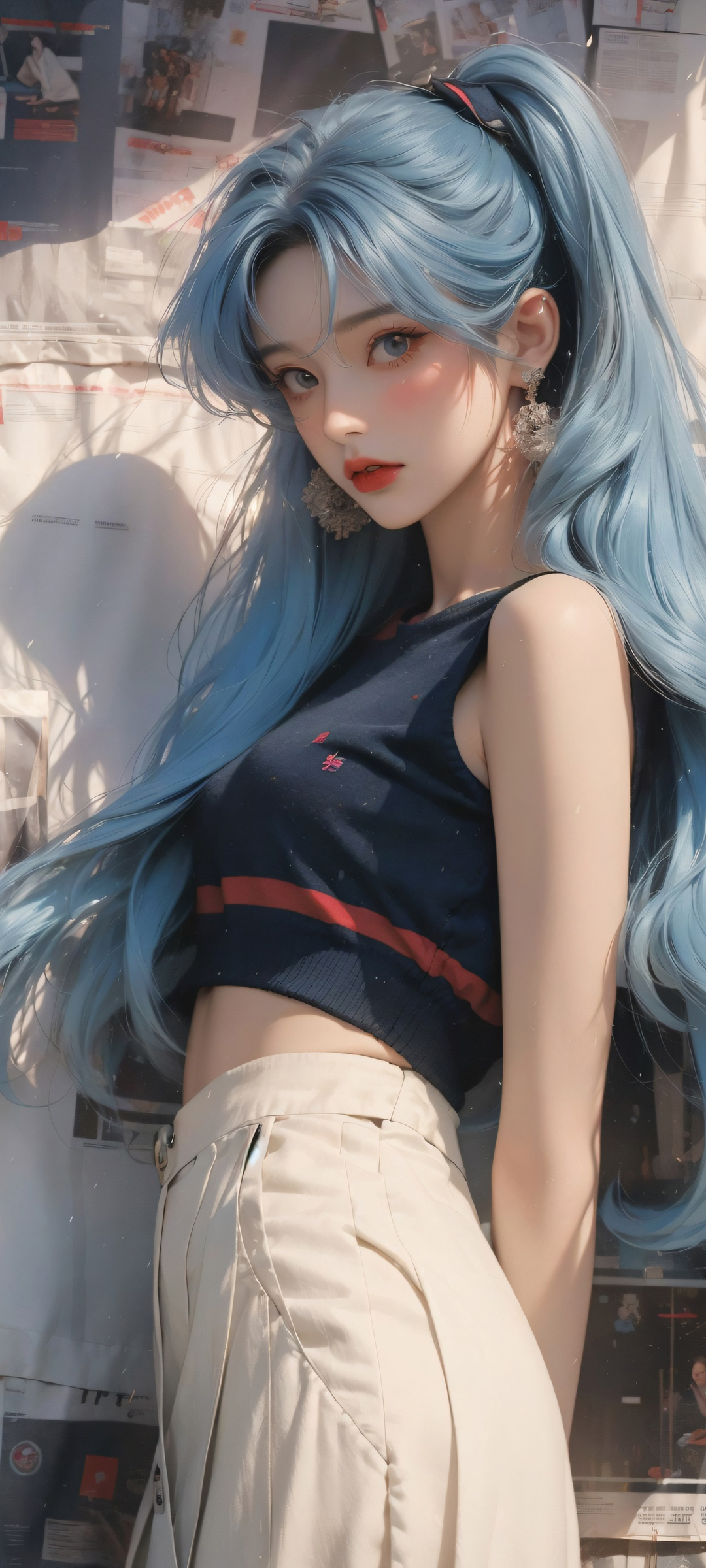 报纸墙背景蓝色长发动漫女孩免费手机壁纸下载