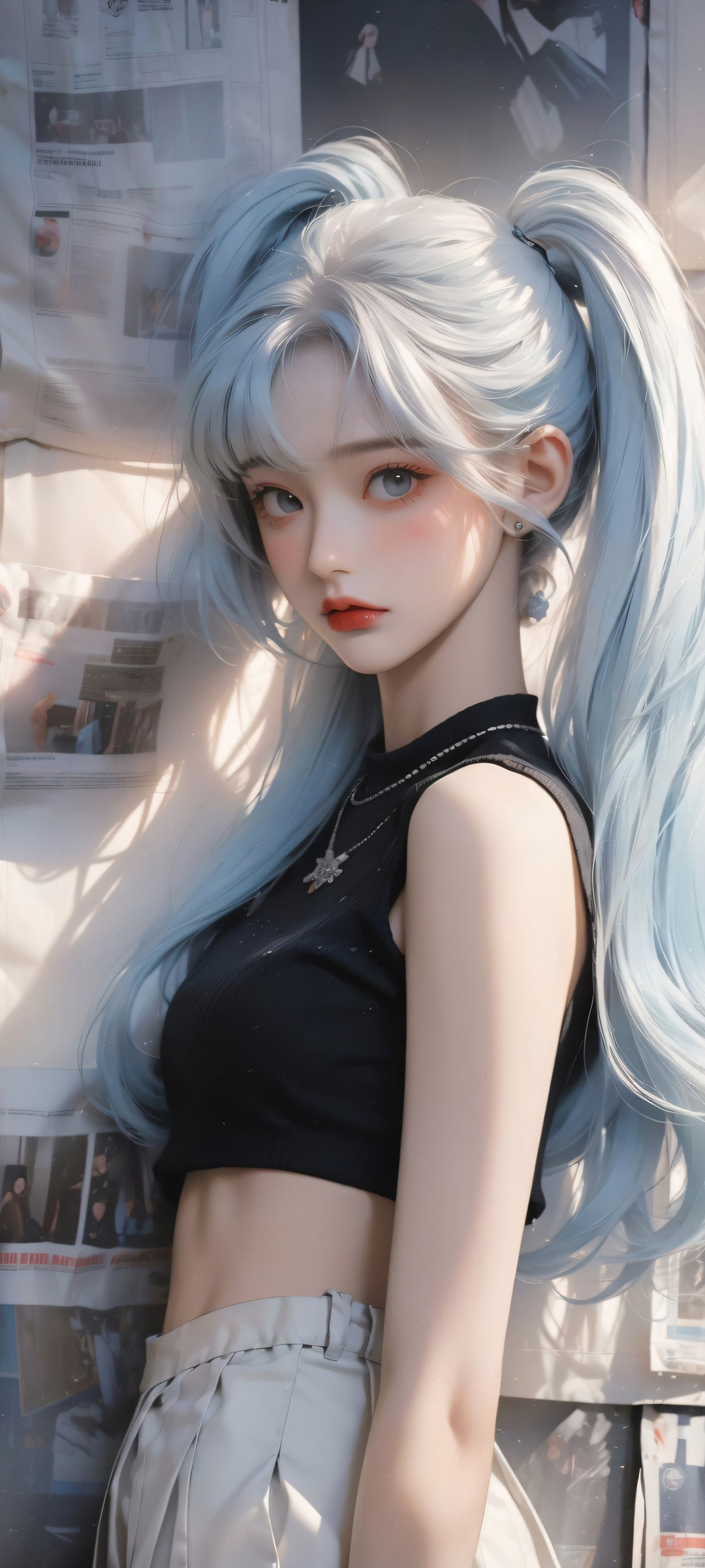 报纸墙双马尾辫女孩动漫手机壁纸免费下载