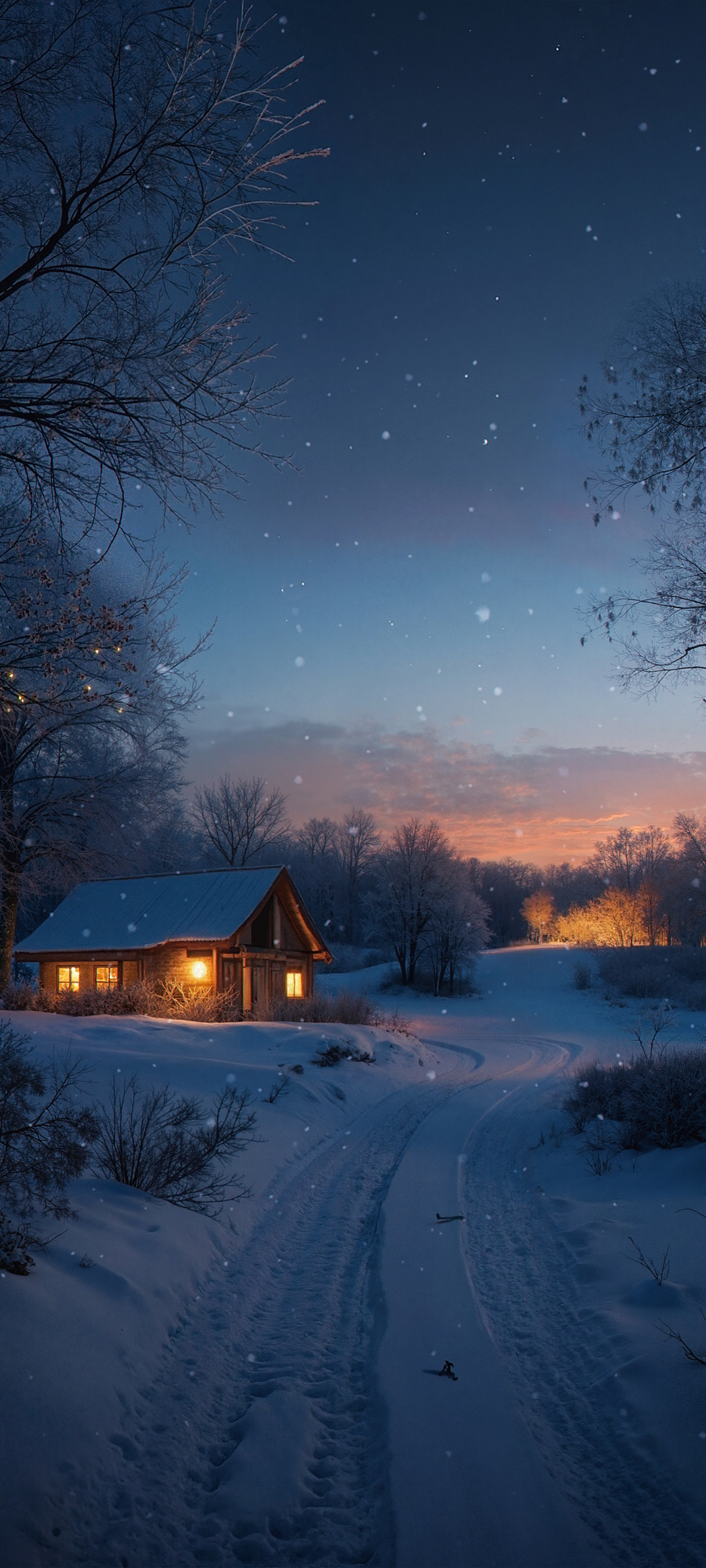夜晚雪景小屋灯光深色风景免费手机壁纸下载