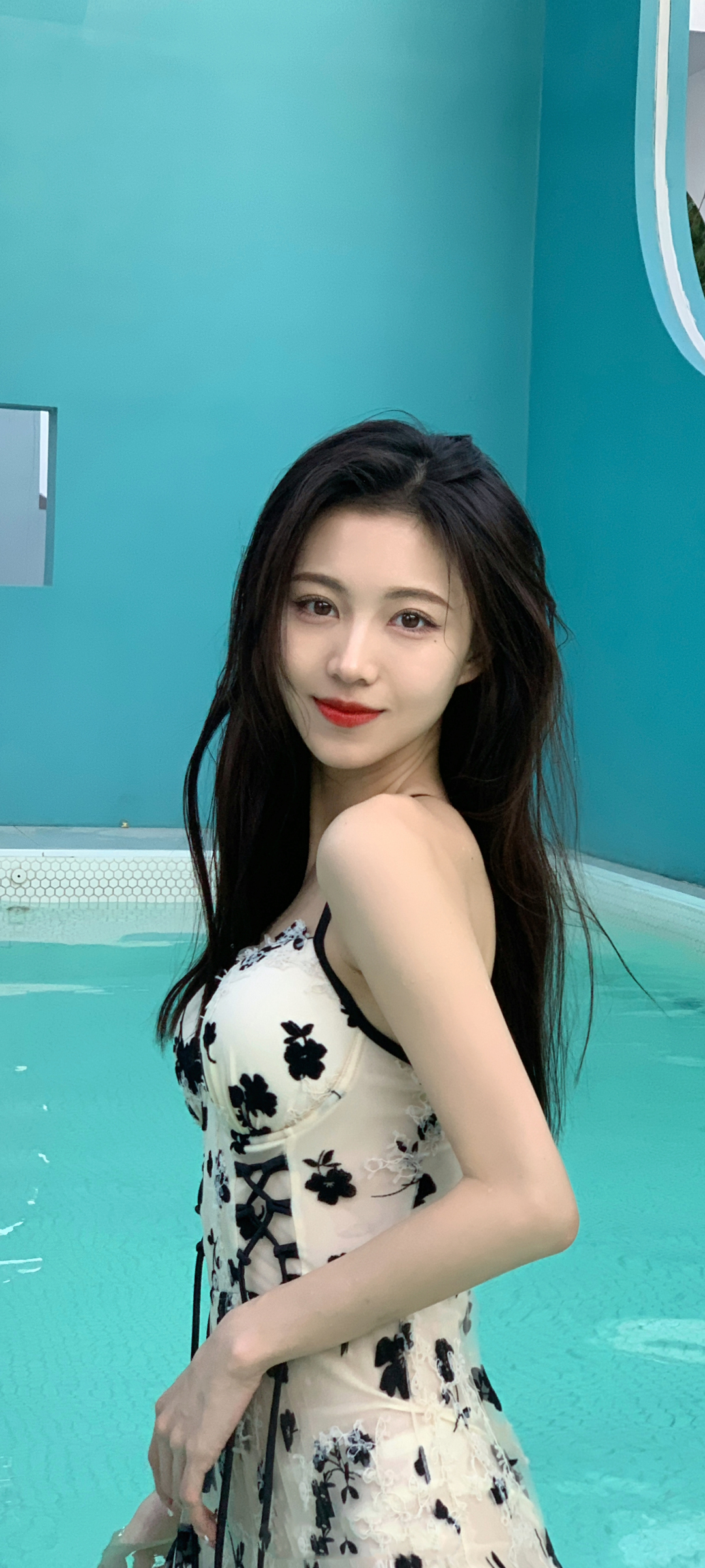 游泳馆泳池畔漂亮美女回头手机壁纸免费下载