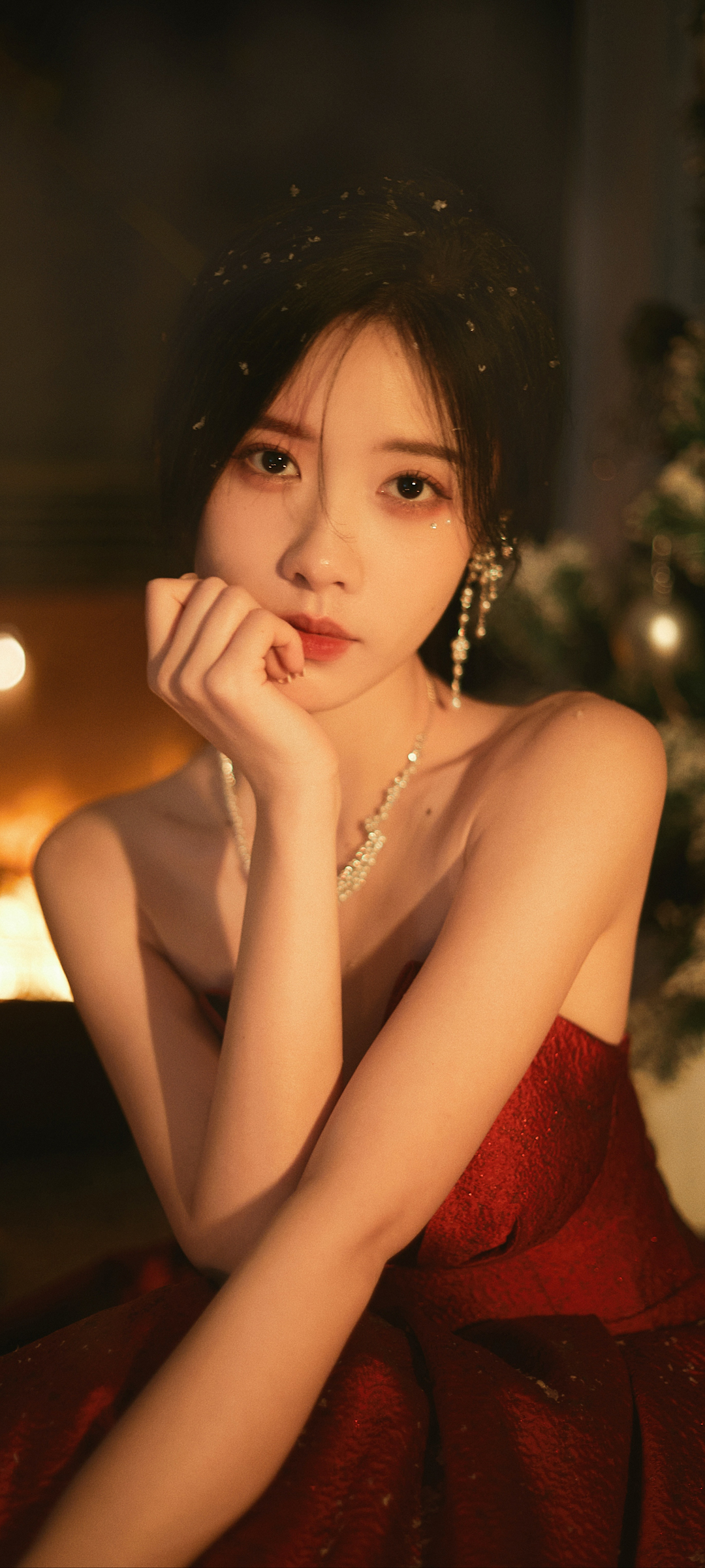 圣诞节红色抹胸裙礼服美女全面屏手机壁纸