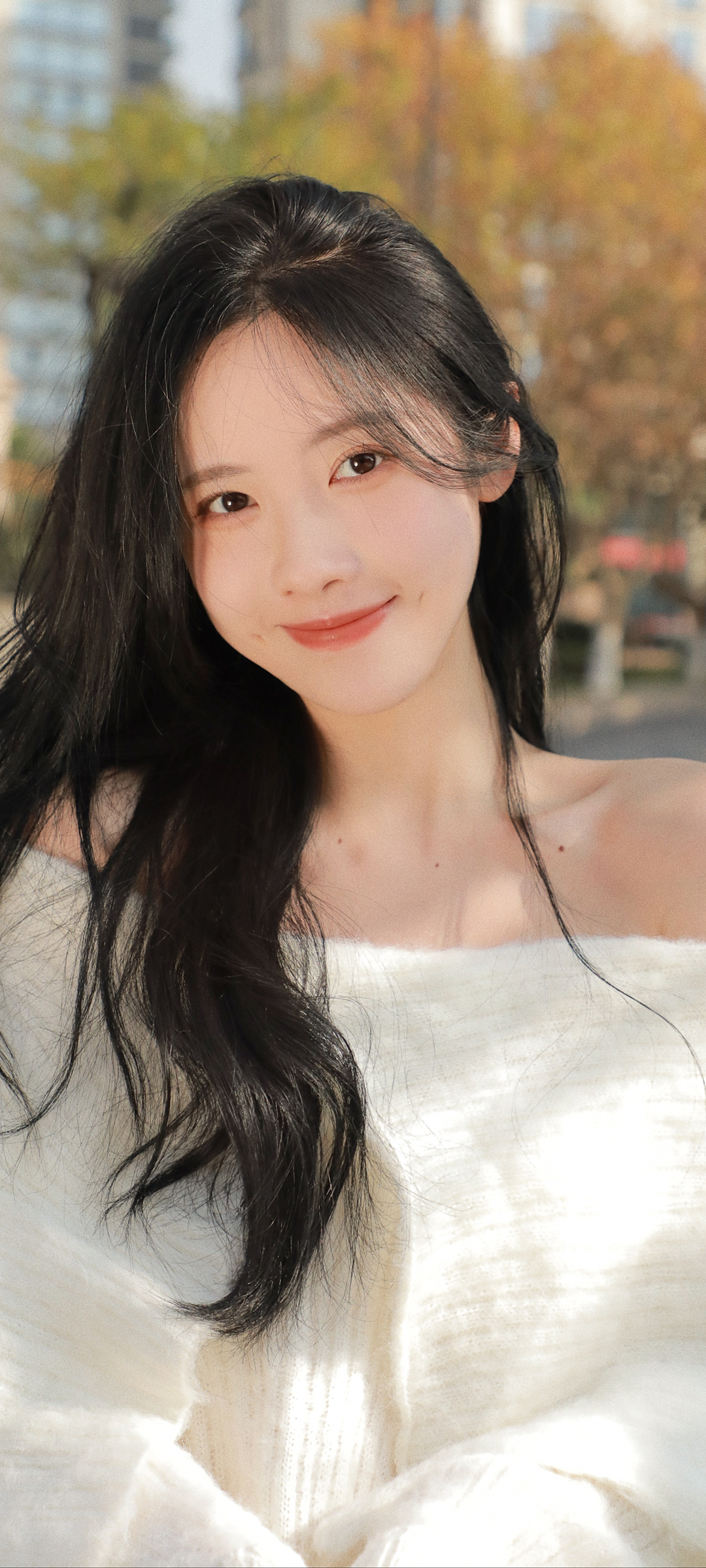 笑容甜美美女 白色毛衣 全面屏手机壁纸