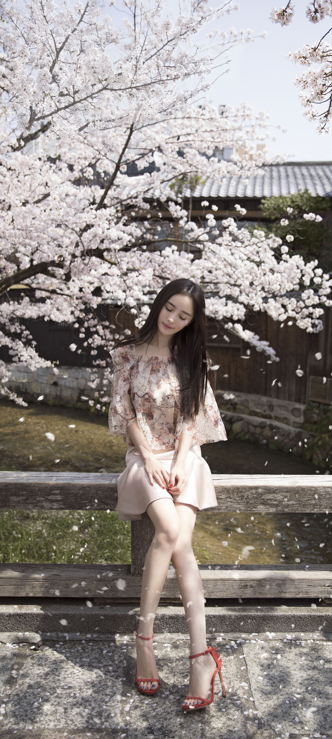 春天美女穿漂亮裙子秀美腿与花景手机壁纸免费下载